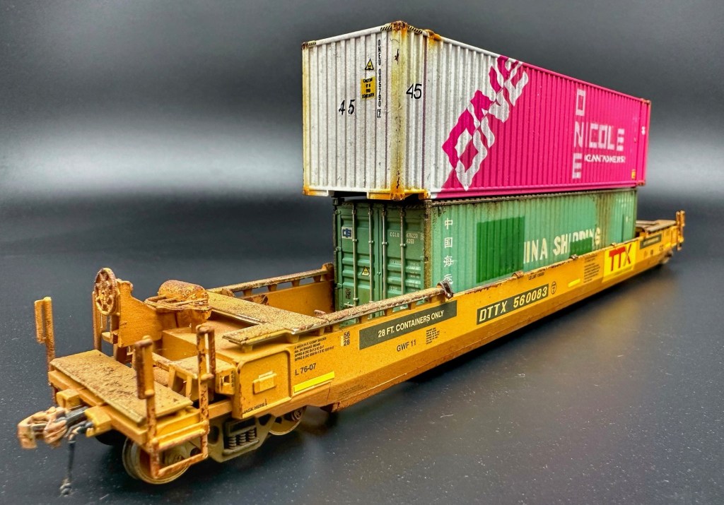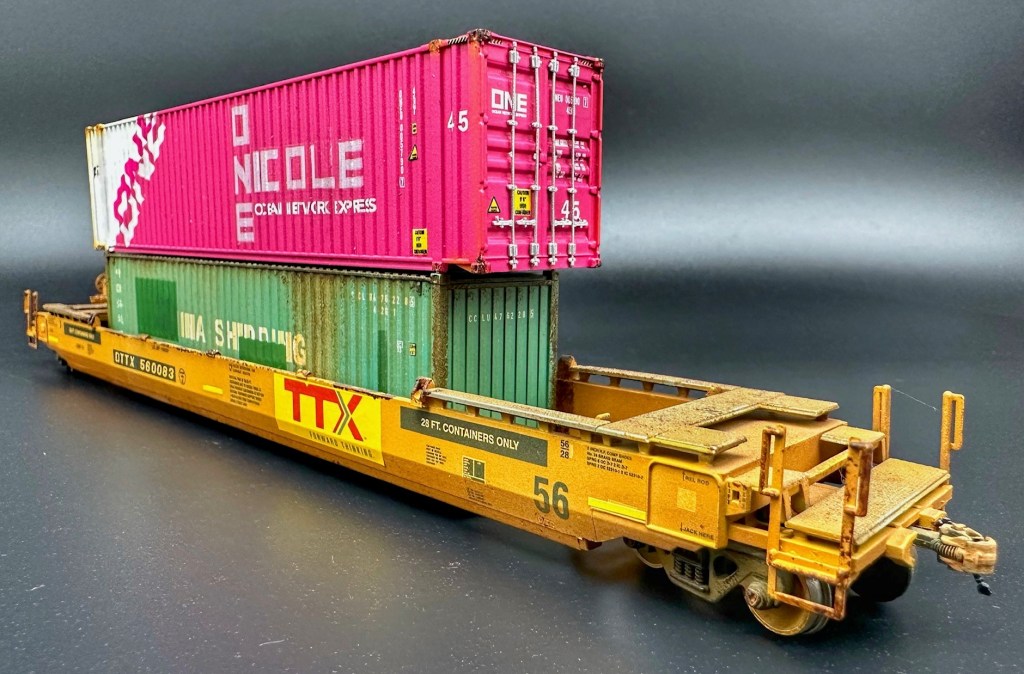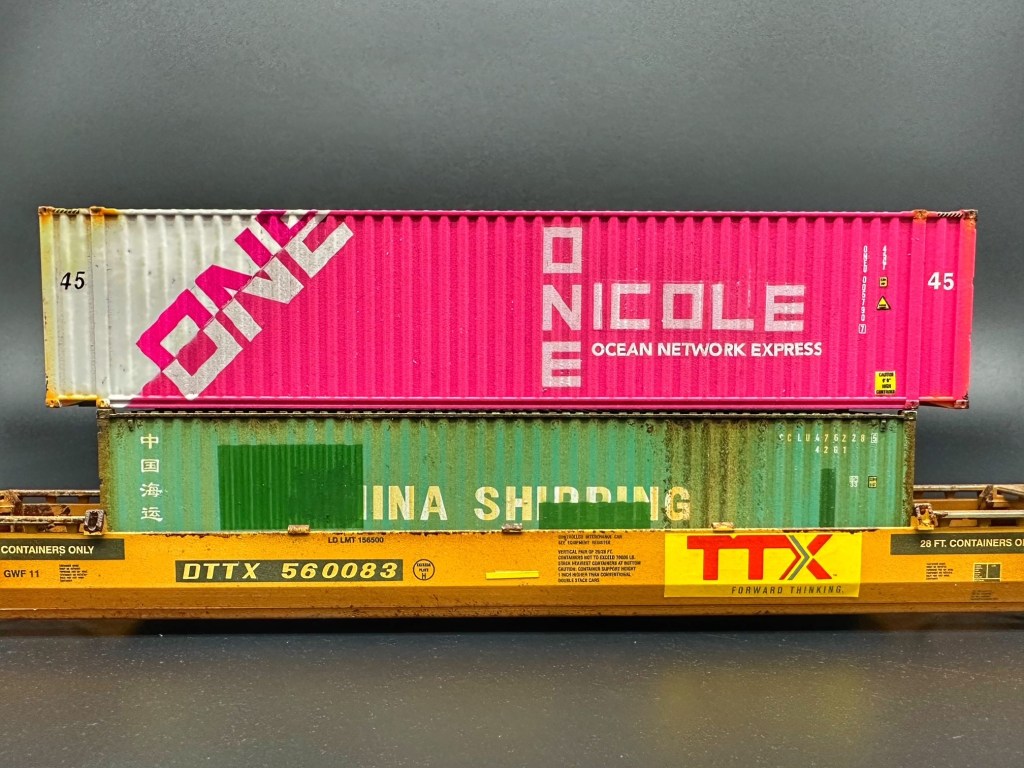 Den unbemalten Container ist von Eve Models, welcher farblich entsprechend nachbehandelt wurde. Besonders das Pink stellte dabei eine grosse Herausforderung dar. Die Decals stammen teilweise von TL Decals (schräge ONE Schrift) und einer Spezialanfertigung von modellbahndecals.de (ONE Nicole).