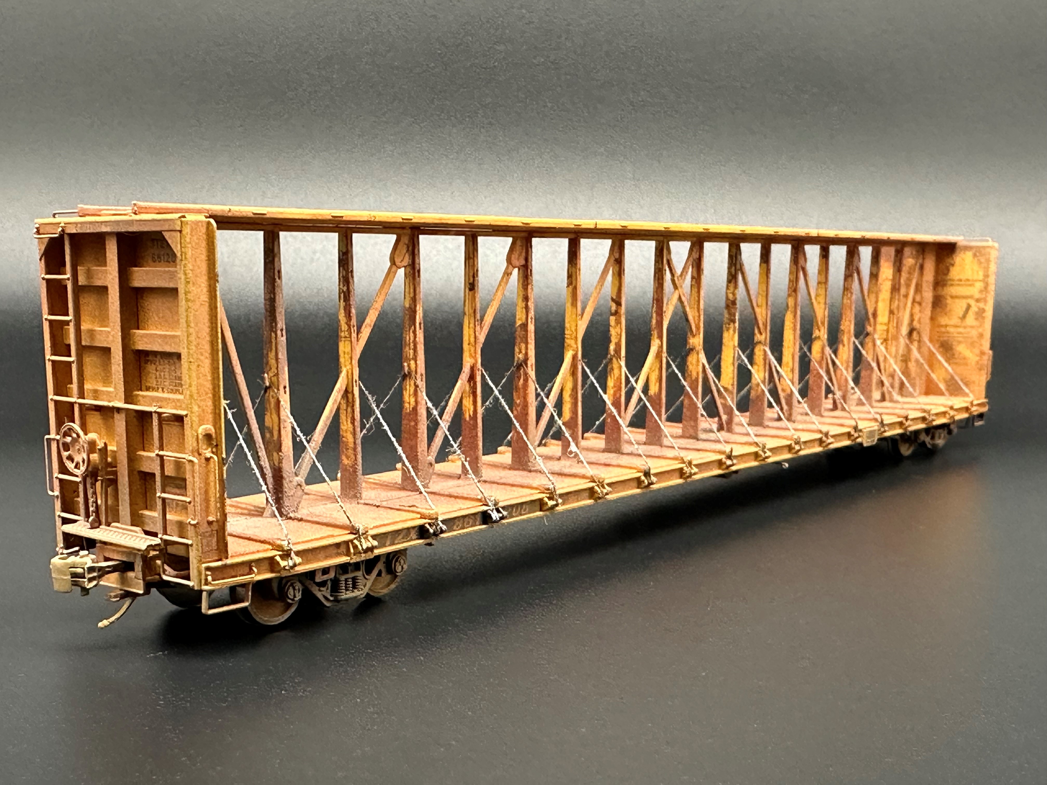 Als Basis für dieses Modell bot sich ein TTX Centerbeam 73″ von Rapido an. Das Weathering erfolgte im wesentlichen mit Farben von AK und Tamiya. Auch gewöhnliche Acrylfarbe fand Verwendung.