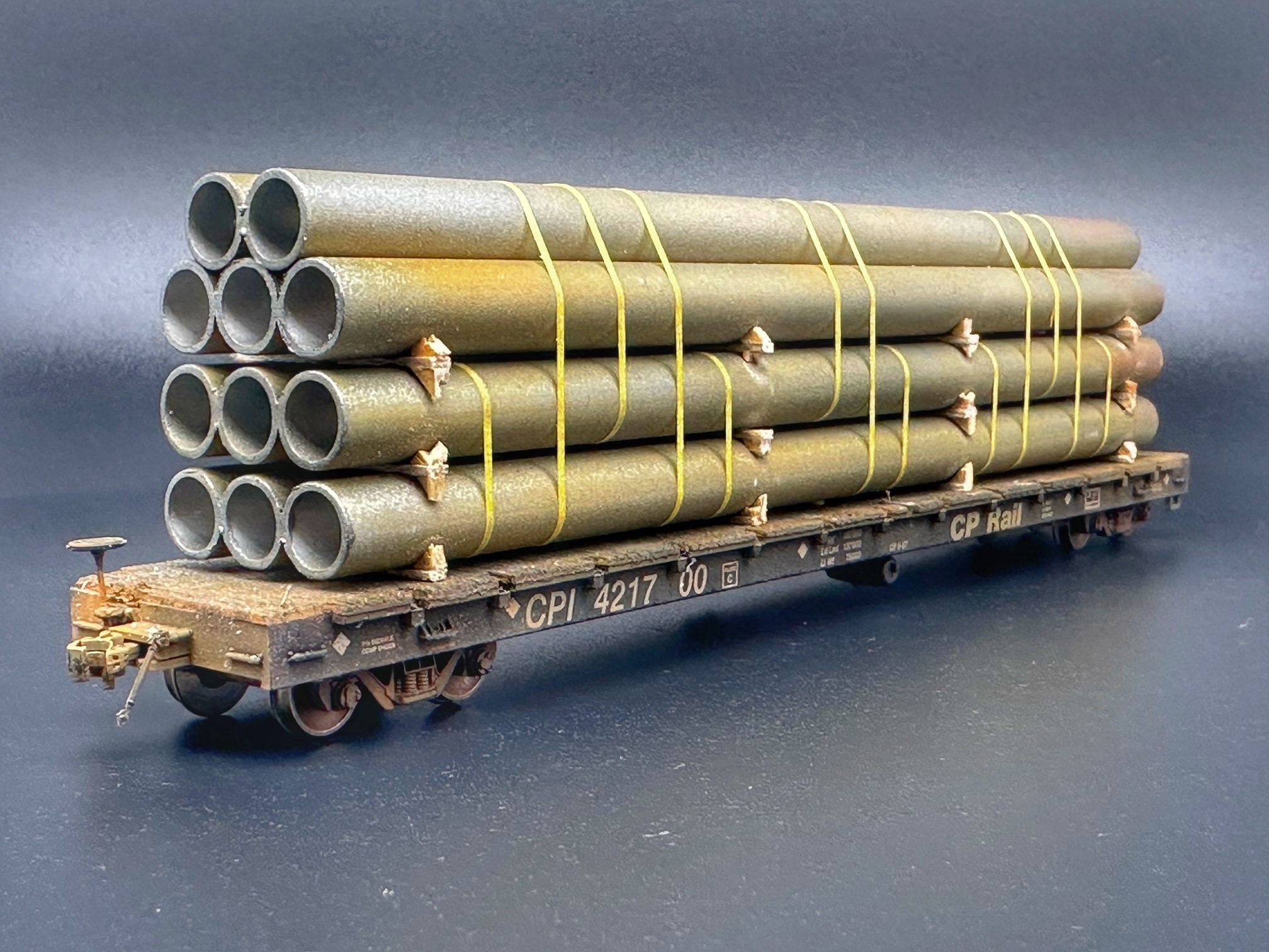 eine kleine Bastellei über Sylvester 24/25. Der Wagenboden wurde mit Echtholz ausgestattet. Entstanden sind drei Wagen mit Rohr-Beladung. Pro Wagen fanden über 7m (!) Röhren aus Polystyrene ihren platz.