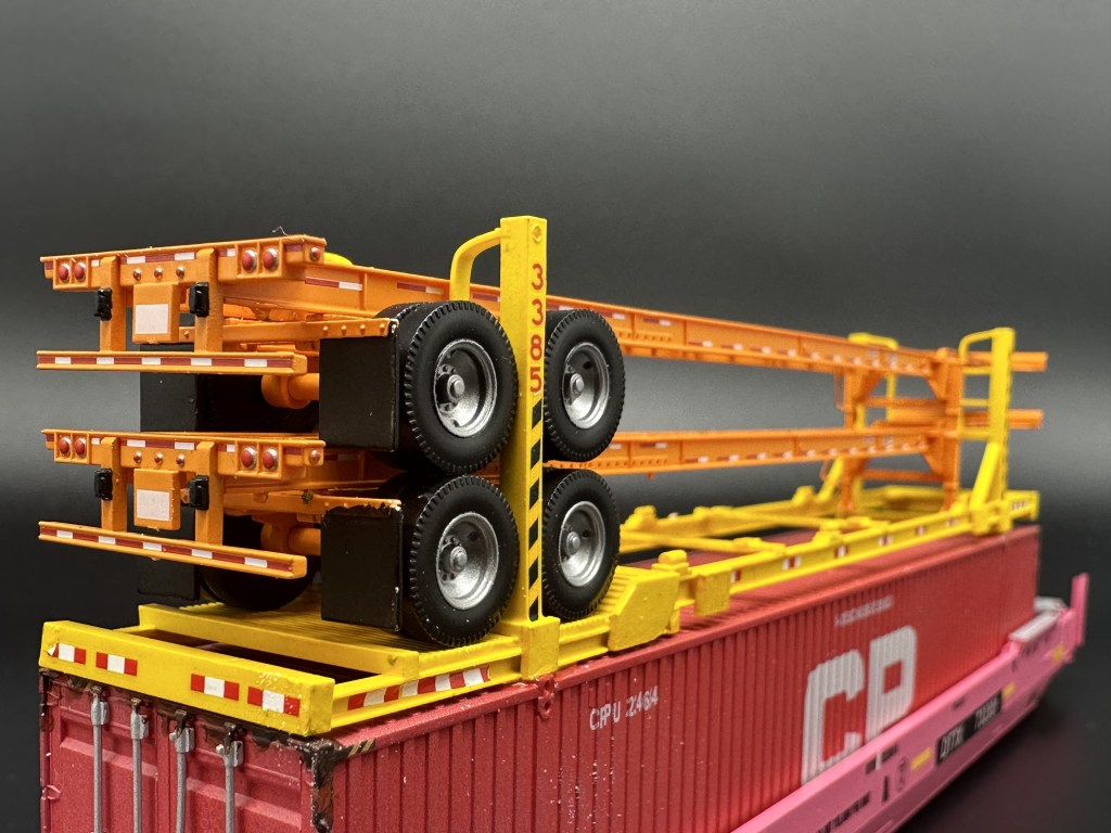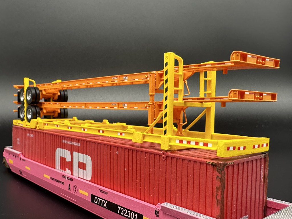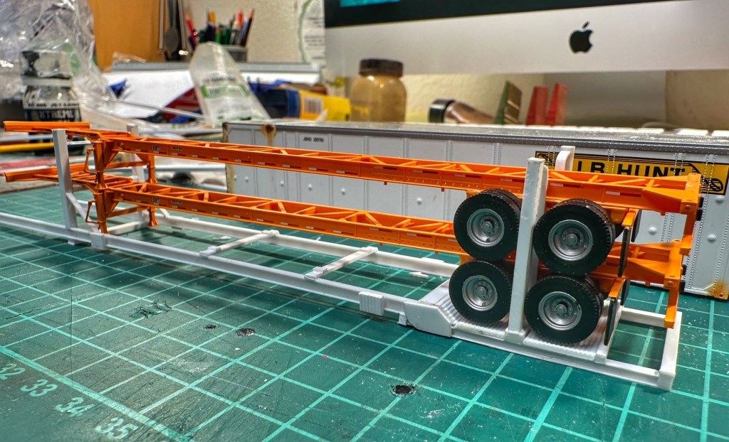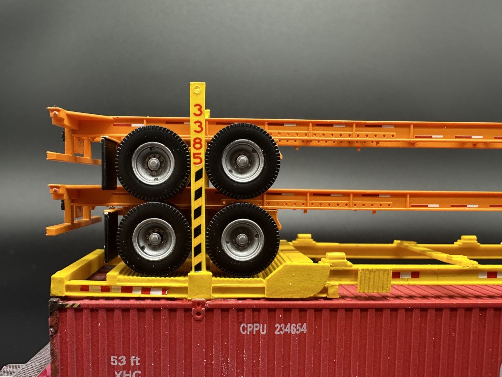 gesehen auf Youtube musste natürlich auch so ein Trailer Rack auf die Gleise resp. auf den Container gebracht werden. Das Teil wurde mit dem wunderbaren Bastelmaterial Styren zusammen gebaut. Die Decals wurden einfach von bestehenden Sheets verwendet.