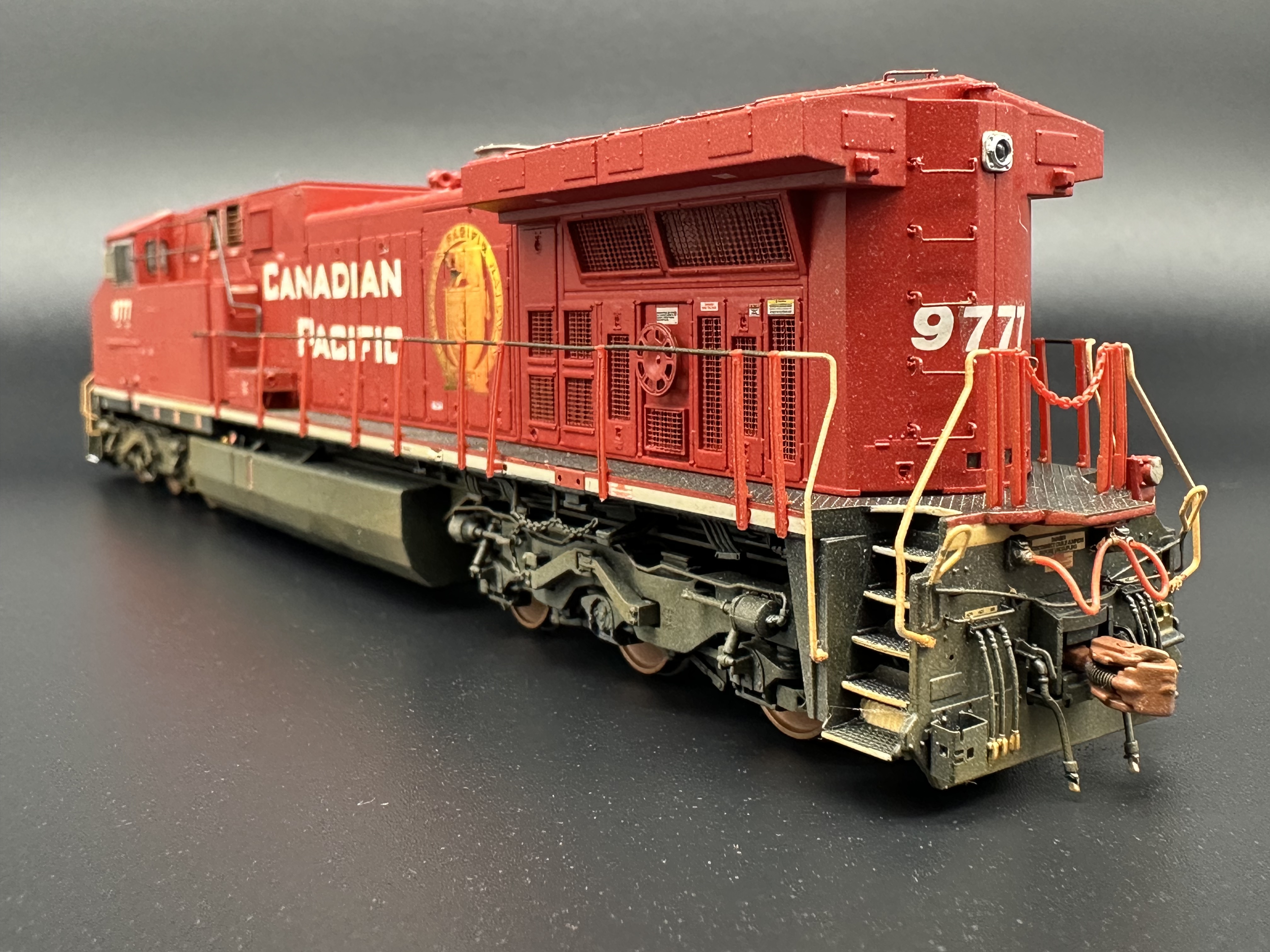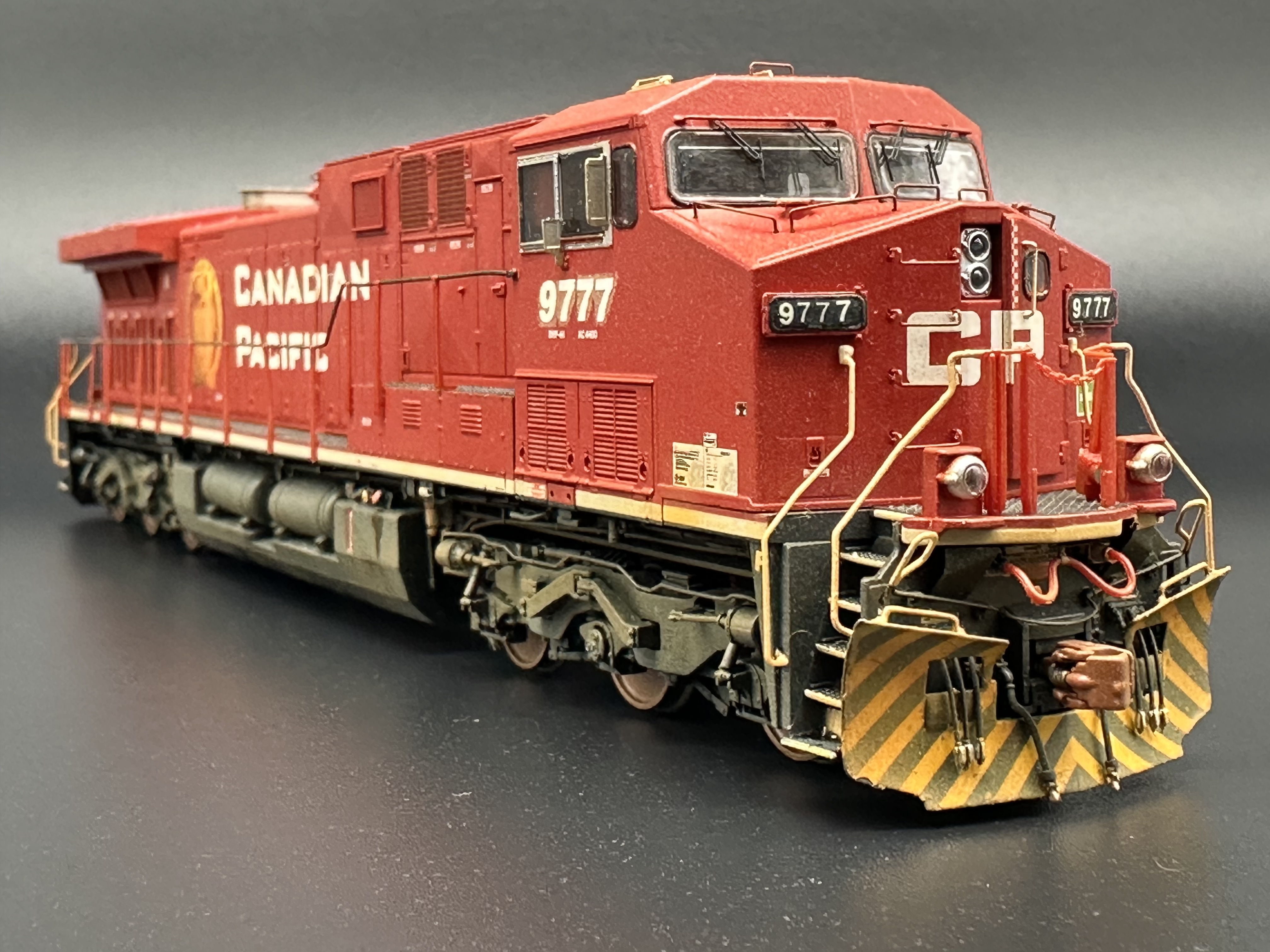 Mein Modell stellt die Lok nach dem Filmdreh dar. Das AWVR Design wurde entfernt, es verblieb aber der Schienenräumer mit Warnanstrich. Eine AC4400CW von Scalemodels diente mir schliesslich als Grundmodell. Der Warnanstrich-Decal wurde von TL Decals genommen. Die 9777 Zahlen stammen von Microscale Decals.