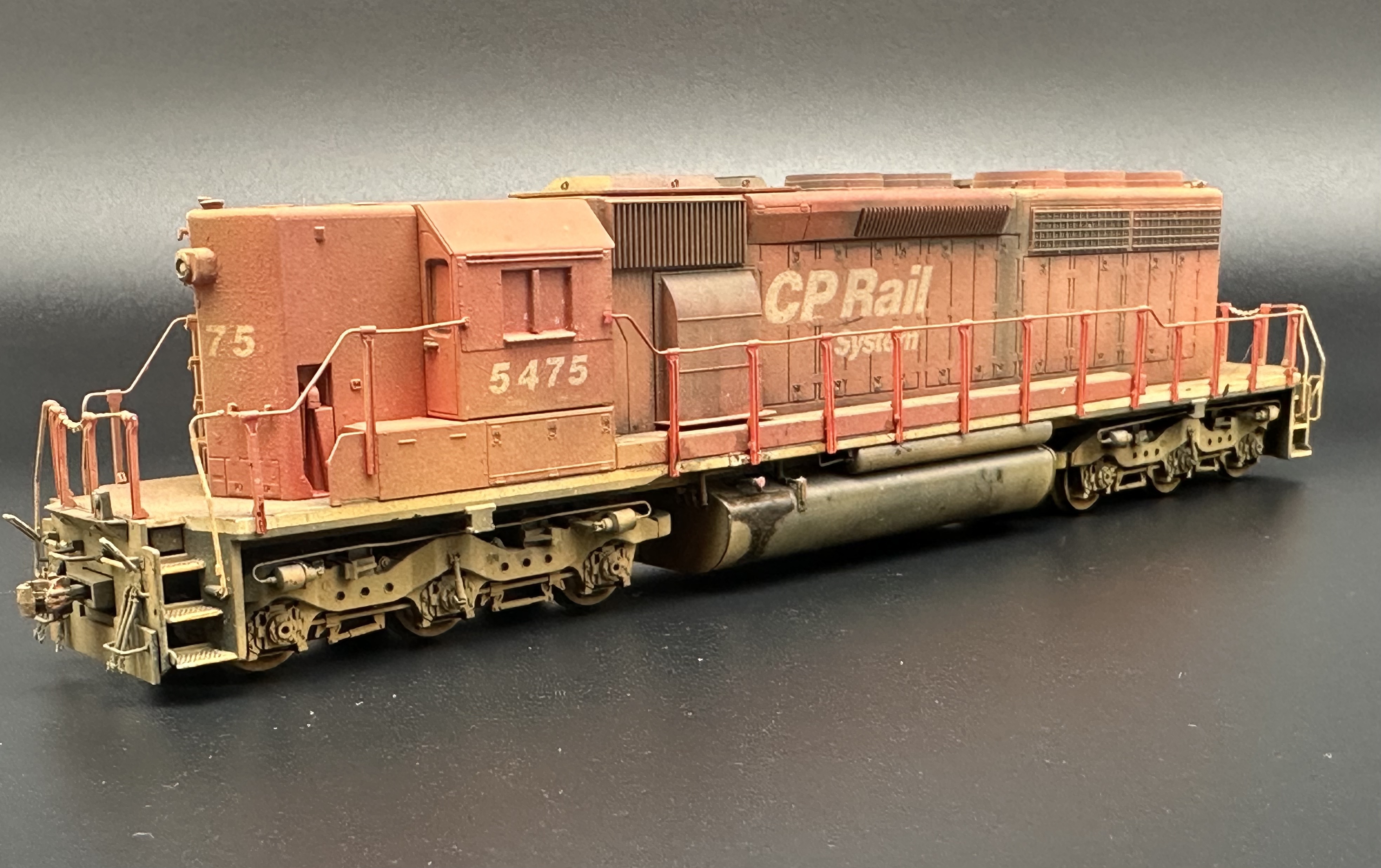 eine weitere SD40-2 High Nose musste die bestehende Flotte ergänzen. Aus einer schwarzen Norfolk Southern SD40-2 High Nose von Broadway Limited wurde schliesslich diese staubige Schönheit in der Variante CP Rail System 5475 B-Unit, entsprechend dem Vorbild ohne Flagge der USA.