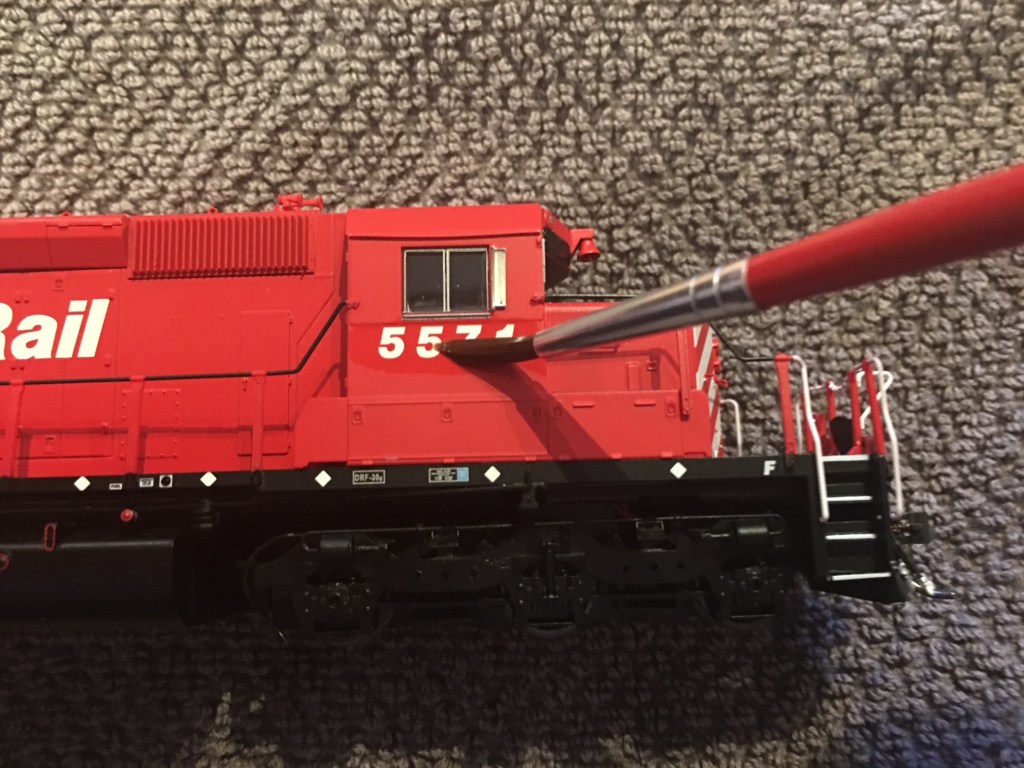Die Leitbleche wurden mit Styrene nach empfunden und mit CP Action Red entsprechend bemalt. Gelabelt wurde die Lok mit Decals von Mircoscale.